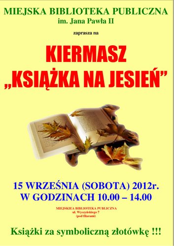 Miejska Biblioteka Publiczna w Rawie Mazowieckiej Zaprasza na kiermasz „Książka na jesień” który odbędzie się 15 września (sobota) 2012 r. w godzinach od 10:00 do 14:00.