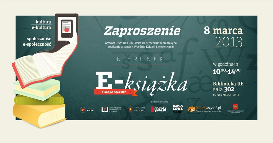 Biblioteka Uniwersytetu Łódzkiego oraz Wydawnictwo Uniwersytetu Łódzkiego w ramach Tygodnia Książki Elektronicznej zapraszają na spotkanie pod hasłem: Kierunek e-książka. Stare po nowemu. Przedsięwzięcie odbędzie się 8 marca 2013 r. w Bibliotece Uniwersytetu Łódzkiego.