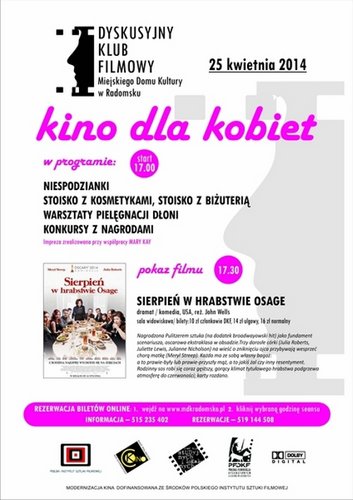 Miejski Dom Kultury zaprasza 25 kwietnia o godz. 17.00 na pokaz specjalny z cyklu KINO DLA KOBIET. O godz. 17.30 rozpocznie się projekcja filmu SIERPIEŃ W HRABSTWIE OSAGE. Bilety w cenie 10-16 zł. Na wszystkie Panie, które odwiedzą tego dnia dom kultury będą konkursy z nagrodami, stoiska z biżuterią i kosmetykami oraz warsztaty pielęgnacji dłoni.