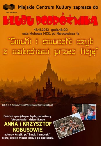 „Smoki i smoczki czyli z maluchami przez Azję” to tytuł książki, która relacjonuje dwumiesięczną wyprawę przez Birmę, Tajlandię i Kambodżę z małymi dziećmi oraz temat czwartkowego spotkania Klubu Podróżnika. . Po spotkaniu będzie można kupić wspomnianą książkę oraz inne z serii „Mali Podróżnicy w Wielkim Świecie” Serdecznie zapraszamy. Mariola Biniek mariola.biniek@mckbel.eu