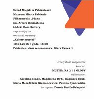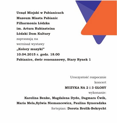 10 kwietnia 2015 roku o godz. 18.00 w Muzeum Miasta Pabianic odbędzie się wernisaż wystawy fotograficznej Kolory muzyki prezentującej klimat koncertów 15. edycji Wędrownego Festiwalu Filharmonii Łódzkiej "Kolory Polski". Wernisażowi towarzyszyć będzie koncert Muzyka na 2 i 3 głosy.