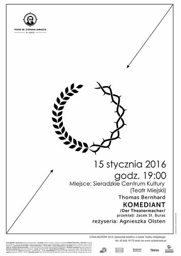 Sieradzkie Centrum Kultury 15 stycznia o godz. 19.00 zaprasza na spektakl "KOMEDIANT" z repertuaru Teatru im. Stefana Jaracza w Łodzi. Dramat prowokacyjnego austriackiego pisarza Thomasa Bernharda reżyseruje Agnieszka Olsten. Bilety w cenie 25 zł.
