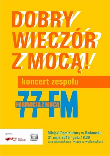 Miejski Dom Kultury w Radomsku i Katolickie Stowarzyszenie "Civitas Christiana" zapraszają na występ formacji muzycznej "77FM Formacja z Mocą". Koncert pt. "Dobry Wieczór z Mocą!" odbędzie się 31 maja 2015 r. o godz. 19.30 w ramach XVI Radomszczańskich Dni Rodziny. Wstęp za wejściówkami