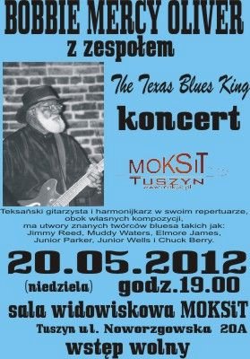 Zapraszamy do Tuszyna na koncert teksańskiego gitarzysty i harmonijkarza - Bobbiego Mercy Olivera. Koncert odbędzie się w Miejskim Ośrodku Kultury, Sportu i Turystyki w Tuszynie, przy ul.Noworzgowskiej 20 A 20 maja o godz. 19.00.