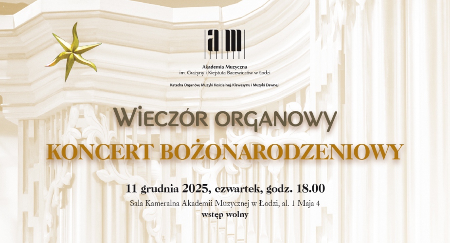 szczegółowe informacje:https://www.amuz.lodz.pl/index.php/pl/wydarzenia/koncerty-i-wydarzenia-zapowiedzi/2752-wieczor-organowy-2025-12-11?fbclid=IwZXh0bgNhZW0CMTAAYnJpZBEwSzJmNGlraGdMdkZIMGh6UHNydGMGYXBwX2lkEDIyMjAzOTE3ODgyMDA4OTIAAR5Vx0HAqLxzyE9a_XQ2odGz9UTsHXri50h5K6jJcD-NmVLnNCmzUOspZxJh9A_aem_wXkLooOMOO2y8KSXhcfsnQ