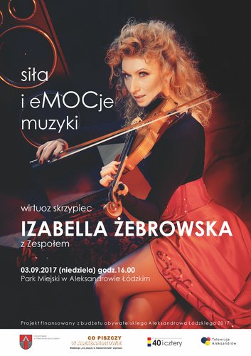W pierwszą niedzielę września redakcja pisma "Co piszczy w Aleksandrowie" zaprasza na spotkanie z czytelnikami i koncert niezwykłej artystki, wirtuoza skrzypiec - Izabelli Żebrowskiej. Muzyczna uczta rozpocznie się o godz. 16.00 w Parku Miejskim w Aleksandrowie.