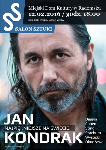 "Najpiękniejsze na świecie" - to tytuł recitalu Jana Kondraka, który odbędzie się 12 lutego 2016 o godz. 18.00 w ramach VI Salonu Sztuki. To także osobisty wybór artysty i poniekąd zapis jego drogi życiowej. Zaczynał bowiem swoją edukację estradową od utworów Bułata Okudżawy. Potem stał się piewcą twórczości Edwarda Stachury, na tyle skutecznym, że aż odnotowanym w oficjalnej biografii poety. A chwilę później zaczął być nie mniej ceniony jako autor piosenek i tłumacz tychże. Oprócz pieśni wspomnianych twórców, w programie koncertu będą także utwory z repertuaru Joan Baez, Żanny Biczewskiej, Joe Dassina, Stinga, Michaela Buble, Włodzimierza Wysockiego, i Leonarda Cohena. Tłumaczenia są dziełem głównie samego wykonawcy, bądź zostały wykonane specjalnie na jego życzenie. Artysta nawiązuje bliski kontakt z widownią poprzez anegdoty dotyczące poszczególnych piosenek i często wspólne wykonywanie refrenów pieśni.