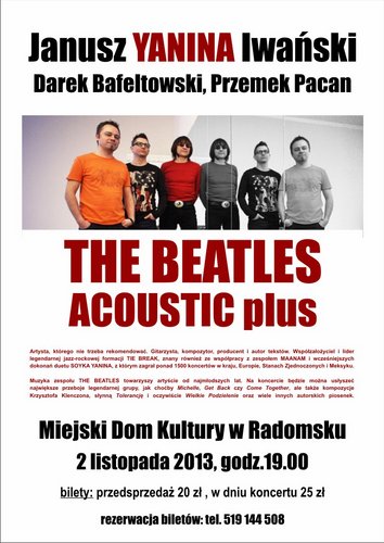 2 listopada o godz. 19.00 w Miejskim Domu Kultury w Radomsku odbędzie się koncert artysty, którego nie trzeba rekomendować - Janusza Yaniny Iwańskiego. Na koncercie będzie można usłyszeć nie tylko największe przeboje legendarnej grupy The Beatles ale także kompozycje Krzysztofa Klenczona i wiele innych autorskich piosenek.
