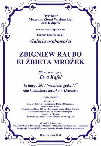 16 lutego o godz. 17.00 zapraszamy do sali kominkowej Muzeum Wnętrz Dworskich w Ożarowie Oddział Muzeum Ziemi Wieluńskiej na koncert kameralny w wykonaniu Zbigniewa Raubo i Elżbiety Mrożek.