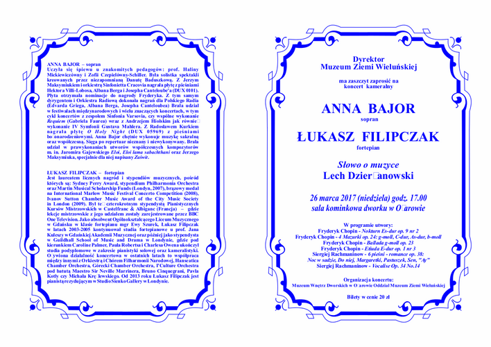 Muzeum Ziemi Wieluńskiej 26 marca o godz. 17.00 zaprasza na koncert kameralny w zabytkowym Dworku w Ożarowie. Wykonawcy: Anna Bajor (sopran) i Łukasz Filipczak (fortepian). Słowo o muzyce: Lech Dzierżanowski.