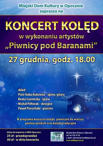 27 grudnia o godz. 18.00 w Miejskim Domu Kultury w Opocznie odbędzie się koncert kolęd w wykonaniu artystów „Piwnicy pod Baranami”. Podczas koncertu wystąpią: Piotr „Kuba” Kubowicz – śpiew i gitara, Beata Czernecka – śpiew, Michał Półtorak – skrzypce i Paweł Pierzchała – pianino. Wstęp: 25-30 zł.