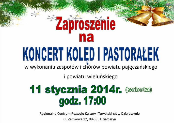 Regionalne Centrum Rozwoju Kultury i Turystyki z/s w Działoszynie zaprasza na koncert kolęd, który odbędzie się 11 stycznia o godz. 17:00. Kolędy i pastorałki wykonają zespoły i chóry z powiatu pajęczańskiego i wieluńskiego.