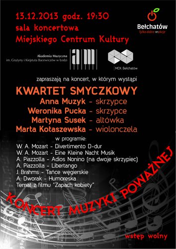 13 grudnia o godzinie 19.30 w sali koncertowej Miejskiego Centrum Kultury w Bełchatowie, odbędzie się koncert Kwartetu Akademii Muzycznej im. Grażyny i Kiejstuta Bacewiczów w składzie: Anna Muzyk, Weronika Pucka, Martyna Susek i Marta Kotaszewska. Wstęp wolny!