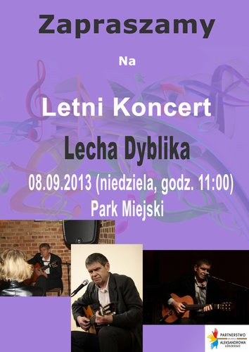 Partnertstwo Na Rzecz Aleksandrowa Łódzkiego zaprasza na koncert wszystkim znanego Lecha Dyblika, który odbędzie się w niedzielę 8 września o godz. 11.00 w Parku Miejskim w Aleksandrowie Łódzkim.