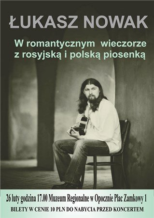 Muzeum Regionalne w Opocznie zaprasza na koncert barda Łukasza Nowaka, w repertuarze rosyjskich i polskich piosenek romantycznych, który odbędzie się 26 lutego o godzinie 17.00. Wstęp 10 zł.