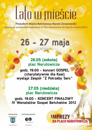 Miejskie Centrum Kultury w Bełchatowie zaprasza na letnie koncerty plenerowe. W najbliższy weekend spotykamy się na pl. Narutowicza by posłuchać pięknych, gospelowych utworów w wykonaniu zespołu „Z potrzeby serc” (26.05, sobota) oraz zespołu, który powstanie w trakcie Warsztatów Gospel (27.05 niedziela).