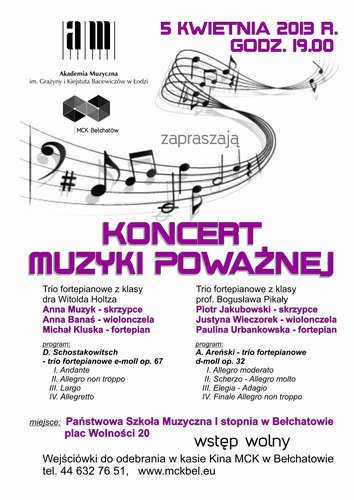 Zapraszamy Państwa na kolejny koncert muzyki poważnej, który odbędzie się w naszym mieście dzięki współpracy z Akademią Muzyczną im. Grażyny i Kiejstuta Bacewiczów w Łodzi. Tym razem wystąpią studenci dra Witolda Holtza oraz prof. Bogusława Pikały. W programie utwory D.Schostakowitscha i A. Areńskiego. Koncert odbędzie się 5 kwietnia, o godz. 19:00, w Państwowej Szkole Muzycznej I stopnia w Bełchatowie, Wstęp wolny.