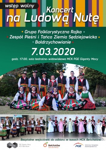 Folklor, muzyka i taniec to dziedzictwo kultury ludowej. Podczas tego wyjątkowego koncertu będziecie mogli Państwo poznać tańce, pieśni narodowe i regionalne, a także poczuć kulturę ludową. Na scenie sali teatralno-widowiskowej zaprezentują się trzy formacje: Grupa folklorystyczna „Rajka", Zespół Pieśni i Tańca „Ziemia Sędziejowicka", oraz „Bałdrzychowianie".