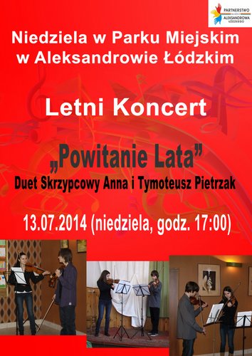 Partnerstwo Na Rzecz Aleksandrowa Łódzkiego zaprasza 13 lipca o godz. 17.00 na pierwszą letnią Niedzielę w Parku Miejskim w Aleksandrowie. Na powitanie lata zagra duet skrzypcowy: Anna i Tymoteusz Pietrzak. Wstęp wolny!