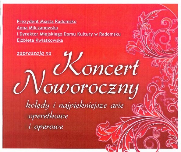 Prezydent Miasta Radomsko Anna Milczanowska i Dyrektor Miejskiego Domu Kultury w Radomsku Elżbieta Kwiatkowska zapraszają 5 stycznia 2013 r. o godz. 18.00 na Koncert Noworoczny.