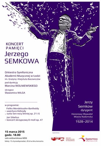 Miasto Radomsko i Miejski Dom Kultury w Radomsku zapraszają 15 marca o godz. 18.00 na "Koncert Pamięci Jerzego Semkowa". Wystąpi Orkiestra Symfoniczna Akademii Muzycznej im. K. i G. Bacewiczów w Łodzi pod dyrekcją Marcina Wolniewskiego, skrzypce - Sławomira Wilga.