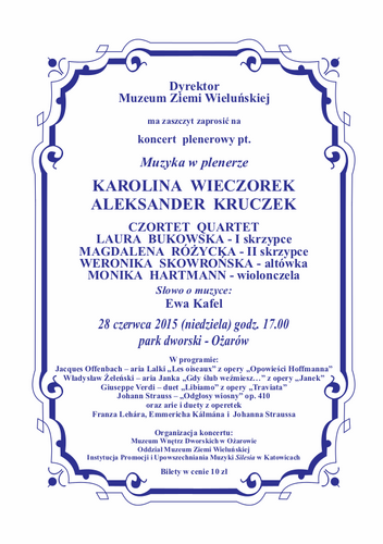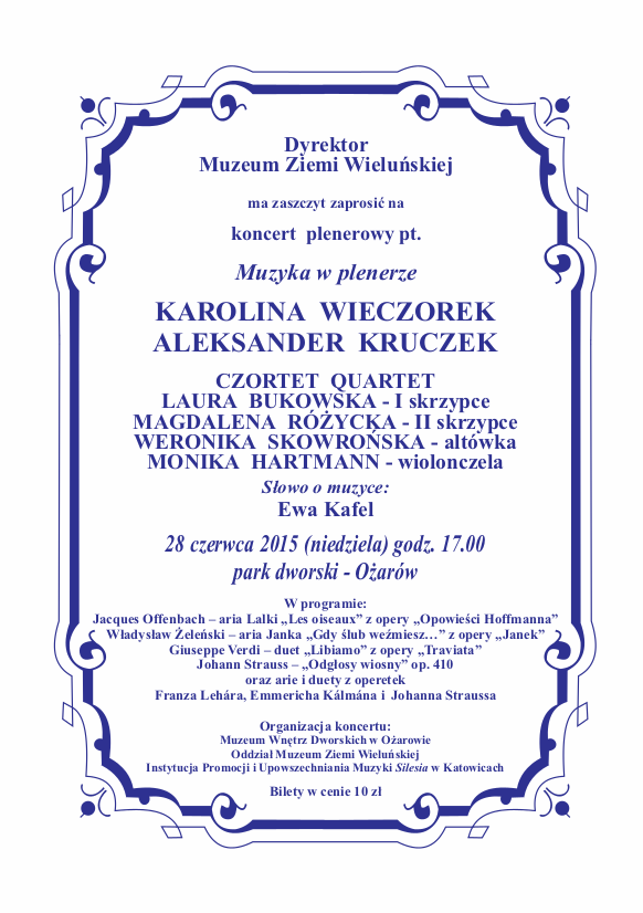 28 czerwca o godz. 17.00 w parku dworskim w Ożarowie odbędzie się plenerowy koncert w wykonaniu Karoliny Wieczorek, Aleksandra Kruczka i grupy CZORTET QUARTET. Bilety w cenie 10 zł