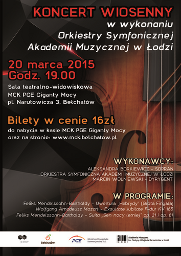 Z okazji nadchodzącej wiosny Miejskie Centrum Kultury w Bełchatowie dziś o godz. 19.00 zaprasza na koncert wiosenny w wykonaniu Orkiestry Symfonicznej Akademii Muzycznej im. Grażyny i Kiejstuta Bacewiczów w Łodzi. Bilety w cenie 16 zł.