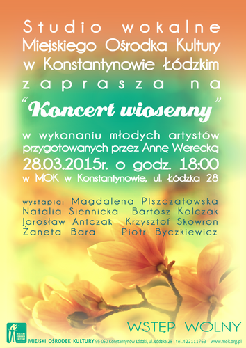 Studio wokalne Miejskiego Ośrodka Kultury w Konstantynowie Łódzkim zaprasza 28 marca o godz. 18.00 na Koncert wiosenny w wykonaniu młodych artystów przygotowanych przez Annę Werecką. Wstęp wolny!