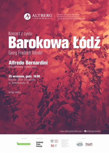 Alfredo Bernardini urodził się we Włoszech, studiował muzykę dawną w Holandii, którą ukończył w 1987 roku. Od tego czasu występował na całym świecie jako członek takich zespołów, jak Hesperion XX, Le Concert des Nations, La Petite Bande, The Amsterdam Baroque Orchestra , The English Concert, Bach Collegium Japan i inne. Zagrał w ponad 100 nagraniach. Jest członkiem-założycielem zespołu Zefiro, który otrzymał ważne międzynarodowe nagrody. Był gościnnym dyrektorem orkiestr barokowych w całej Europie, w Kanadzie, Australii, Wenezueli, na Kubie, w Izraelu oraz z European Union Baroque Orchestra. Po wykładach w Konserwatorium Amsterdamskim i ESMUC w Barcelonie, obecnie jest profesorem na Uniwersytecie Mozarteum w Salzburgu.Podczas koncertu zabrzmią utwory Georga Friedricha Händela, niemieckiego kompozytora późnego baroku, który dokonał syntezy barokowych osiągnięć muzycznych, zwłaszcza niemieckich, włoskich i angielskich. W 1727 roku stał się poddanym Wielkiej Brytanii. Jest narodowym kompozytorem tego kraju. Komponował liczne gatunki muzyki baroku, między innymi opery i oratoria. Händel zaliczany jest do najwybitniejszych twórców muzyki późnego baroku.