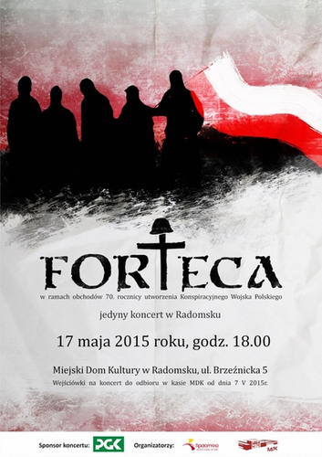 W ramach obchodów 70. rocznicy utworzenia Konspiracyjnego Wojska Polskiego 17 maja o godz. 18.00 w Miejskim Domu Kultury w Radomsku zagra historyczno-patriotyczny zespół rockowy Forteca. Wstęp: wejściówki do odebrania w kasie MDK.