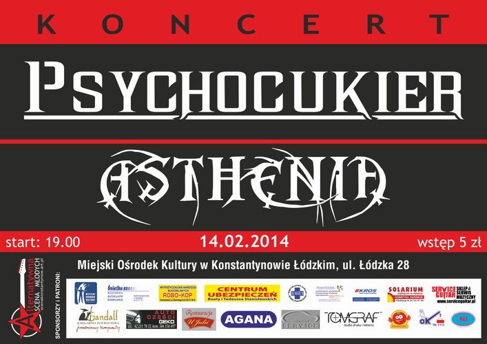 Alternatywna Scena Młodych zaprasza na koncert zespołów Psychocukier i Asthenia! Zagramy 14 lutego 2014r. o godz. 19:00 w Miejskim Ośrodku Kultury w Konstantynowie Łódzkim (ul. Łódzka 28). Wstęp: 5 zł