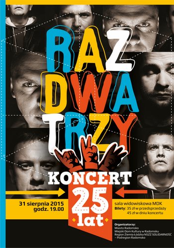 31 sierpnia na scenie Miejskiego Domu Kultury w Radomsku pojawi się zespół RAZ DWA TRZY. Bez względu na wiek - swój i odbiorcy, grupa potrafi trafić w sedno i uchwycić to coś szczególnego, tu i teraz. Ich utwory mają niesamowitą zdolność pobudzania do rozmowy, otwierają umysł i rozwiązują język. Bilety: 35-45 zł. Organizatorzy: Miasto Radomsko, Miejski Dom Kultury w Radomsku, Region Ziemia Łódzka NSZZ "Solidarność - Podregion Radomsko.