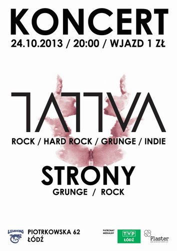 Lizard King w Łodzi zaprasza 24 października o godz. 20.00 na dwugodzinną dawkę grungowo - rockowego grania z łódzką formacją Strony i zespołem Tattva, będącym mieszanką muzycznych żywiołów rocka, hard rocka, indie i grungu. Wejście na koncert za 1 zł!