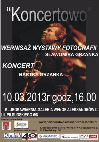 Partnerstwo na rzecz Aleksandrowa zaprasza na wernisaż wystawy fotografii Sławomira Grzanka 10.03.2013 (niedziela) godz.16.00 Klubokawiarnia-Galeria Wenge, Aleksandrów Ł. ul. Piłsudskiego 6/8 wieczór uświetni swoim występem Bartek Grzanek.