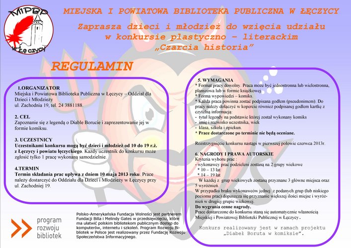 Biblioteka dla dzieci w Łęczycy zaprasza dzieci i młodzież do wzięcia udziału w konkursie plastyczno-literackim "Czarcia historia". Zadaniem uczestników jest stworzenie komiksu na podstawie legendy o Diable Borucie. Termin składania prac upływa 10 maja. Do wygrania cenne nagrody. Konkurs realizowany jest w ramach projektu „Diabeł Boruta w komiksie”.