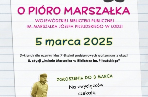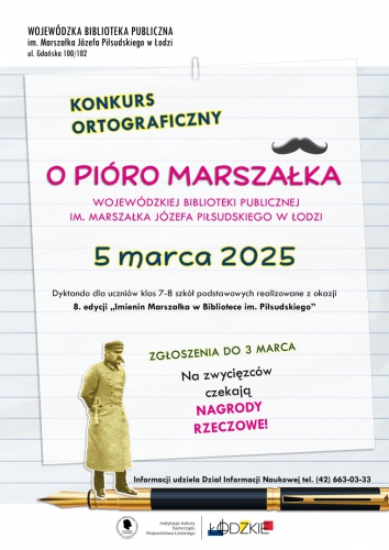5 marca 2025 r. w WBP im. J. Piłsudskiego odbędzie się Konkurs ortograficzny „O PIÓRO MARSZAŁKA”. Dyktando realizowane jest z okazji 8. edycji "Imienin Marszałka w Bibliotece im. Piłsudskiego". Zgłoszenia do 3 marca.