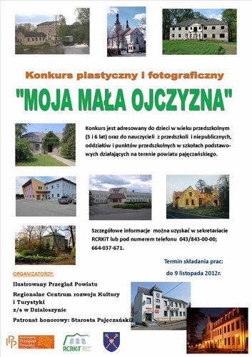 Wszystkie dzieci w wieku przedszkolnym oraz ich opiekunów z powiatu pajęczańskiego zapraszamy do udziału w konkursie "Moja mała ojczyzna". Do 9 listopada br. Regionalne Centrum RozwojuKultury i Turystyki z/s w Działoszynie i Ilustrowany Przegląd Powiatu czekają na prace plastyczne najmłodszych oraz na fotoreportaże wykonane przez pracowników przedszkoli. Nagrody czekają!