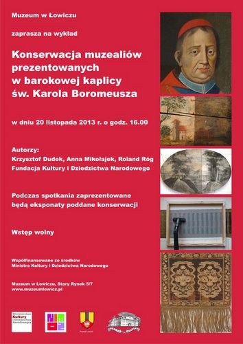 Muzeum w Łowiczu zaprasza 20 listopada o godz. 16.00 na wykład „Konserwacja muzealiów prezentowanych w barokowej kaplicy św. Karola Boromeusza” w ramach programu MKiDN Dziedzictwo kulturowe priorytet Wspieranie działań muzealnych.