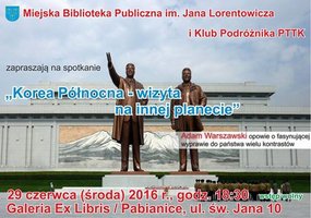 Gościem ostatniego w tym sezonie spotkania w Klubie Podróżnika PTTK w Pabianicach będzie łódzki podróżnik Adam Warszawski, który zabierze uczestników na fascynującą wyprawę do państwa wielu kontrastów - Korei Północnej. Spotkanie odbędzie się w najbliższą środę, 29 czerwca, o godz. 18.30 w Galerii "Ex Libris" MIejskiej Biblioteki Publicznej im. Jana Lorentowicza w Pabianicach. Wstęp wolny!