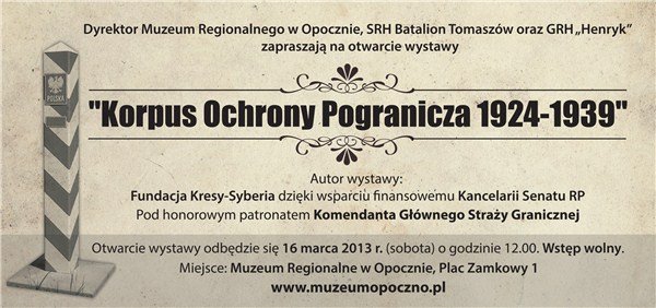 Dyrektor Muzeum Regionalnego w Opocznie, SRH Batalion Tomaszów oraz GRH „Henryk” zapraszają na otwarcie wystawy "Korpus Ochrony Pogranicza 1924-1939" które odbędzie się 16 marca 2013 r. (sobota) o godzinie 12.00 Wstęp wolny.