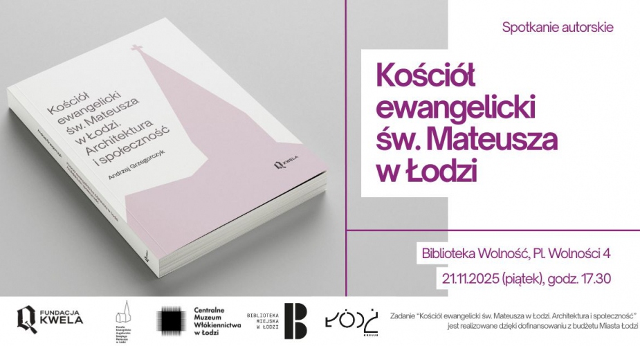 21 listopada o godzinie 17:30 w Bibliotece Wolność (Plac Wolności 4) odbędzie się spotkanie z autorem książki „Kościół ewangelicki św. Mateusza w Łodzi. Architektura i społeczność”, której autorem jest Andrzej Grzegorczyk.