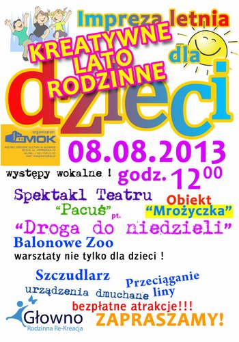 Miejski Ośrodek Kultury w Głownie serdecznie zaprasza na imprezy z cyklu Kreatywne Lato Rodzinne. W programie wiele atrakcji dla dzieci oraz dorosłych. Imprezy odbędą się na terenie Obiektu “Mrożyczka”.