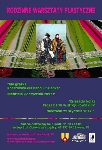 W czasie ferii zimowych Muzeum w Łowiczu zaprasza dzieci wraz z rodzicami i dziadkami na niedzielne warsztaty plastyczne. Pierwsze zajęcia pt. „Ale gratka! Pocztówka dla Babci i Dziadka” odbędą się 22 stycznia 2017. W związku z tym, że warsztaty zbiegają się z obchodami Dnia Babci i Dnia Dziadka, uczestnicy wykonają pocztówki inspirowane kartami z początku XX w., ukazującymi łowickie pejzaże i Księżaków w pasiastych strojach.