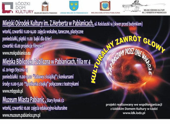 "KULTURALNY ZAWRÓT GŁOWY " to nazwa projektu kulturalnego Miejskiego Ośrodka Kultury im. Zbigniewa Herberta, który na jego realizację otrzymał dofinansowanie w konkursie ogłoszonym przez Łódzki Dom Kultury pod nazwą „Współorganizacja projektów kulturalnych na terenie województwa łódzkiego”. „Kulturalny zawrót głowy” to propozycja na niebanalne spędzenie wakacji dla uczniów pochodzących z mniej zamożnych rodzin.