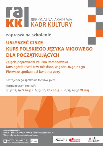 W ramach Regionalnej Akademii Kadr Kultury w kwietniu rozpoczynamy Kurs polskiego języka migowego dla początkujących, który będzie kontynuowany przez trzy miesiące. Pierwsze spotkanie odbędzie się 8 kwietnia br. w Łódzkim Domu Kultury w sali 101, godz. 16.30.