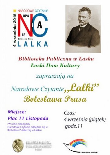 Biblioteka Publiczna w Łasku oraz Łaski Dom Kultury zapraszają 4 września o godz. 11.00 na Narodowe Czytanie "Lalki" Bolesława Prusa. Czytanie odbędzie się na Placu 11 Listopada w Łasku.