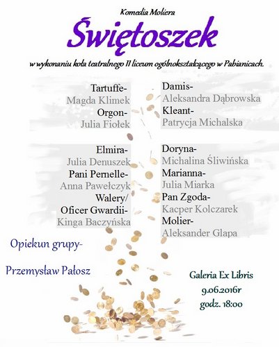 9 czerwca 2016 r. (czwartek) o godz. 18:00 w Galerii Ex Libris Miejskiej Biblioteki Publicznej na ul. św. Jana 10, zobaczymy komedię Moliera pt. „Świętoszek”. Sztuka zostanie wykonana przez koło teatralne II Liceum Ogólnokształcącego w Pabianicach.