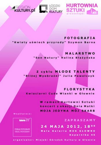 24 maja o godz. 18.00 zapraszamy na wernisaż wystaw malarstwa, fotografi, kidsartu oraz florystyki artystycznej w ramach Hurtowni Sztuki Maj 2012 do Miejskiego Ośrodka Kultury w Głownie. Zobaczymy prace malarskie Haliny Błażynskiej, fotografie autorstwa Szymona Barny, dziecięcy świat plastyczny Julii Pawełczyk oraz florystykę artystyczną.