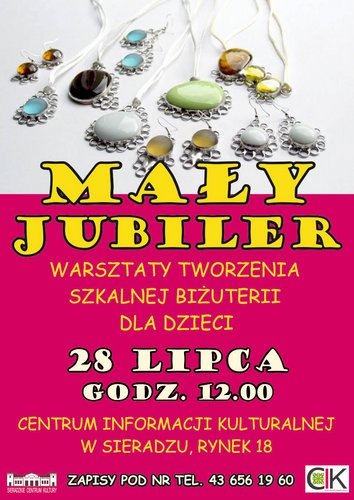 28 lipca o godz. 12.00 w Centrum Informacji Kulturalnej w Sieradzu odbędą się warsztaty tworzenia biżuterii szklanej Mały jubiler. Podczas zajęć dzieci dowiedzą się jak ciąć szkło, korzystać z lutownic i szlifierek do obróbki szkła. Warsztaty są bezpłatne. Ilość miejsc ograniczona. Zapisy trwają!