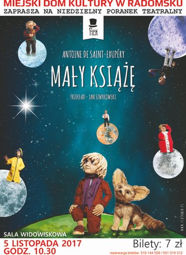 5 listopada młodzi widzowie będą mogli przenieść się w magiczny świat muzyki, sztuki lalkarskiej i bajkowej scenografii za sprawą spetaklu "Mały książe" zrealizowanego przez aktorów Teatru MER z Łodzi. Przedstawienie rozpocznie się o godz. 10.30 w Miejskim Domu Kultury w Radomsku.